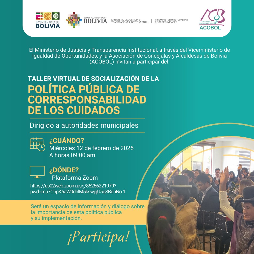El Ministerio de Justicia y Transparencia Institucional Bolivia, a través del Viceministerio de Igualdad de Oportunidades y #ACOBOL, realizan el Taller de Socialización de la Política Pública de #Corresponsabilidad de los Cuidados.
